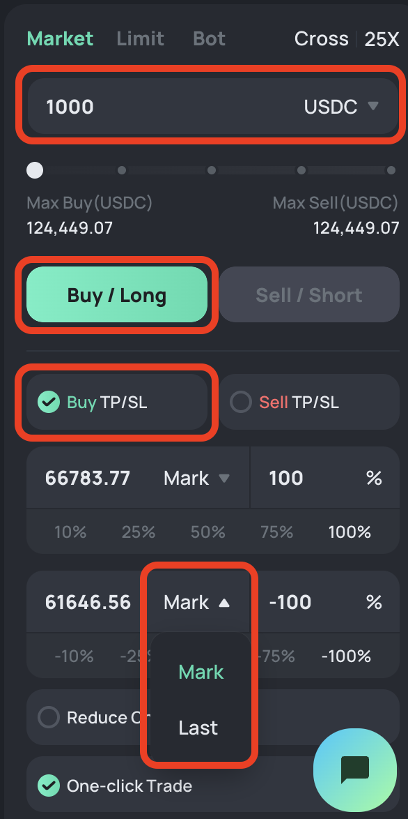 After that users may choose order type, enter the amount, and click **\[TP/SL]** to set the **\[Take Profit]** and **\[Stop Loss]** prices manually based on the **\[Mark Price]** or **\[Last Price]**. Next, click **\[Buy/Long]** or **\[Sell/Short]** to place the order.