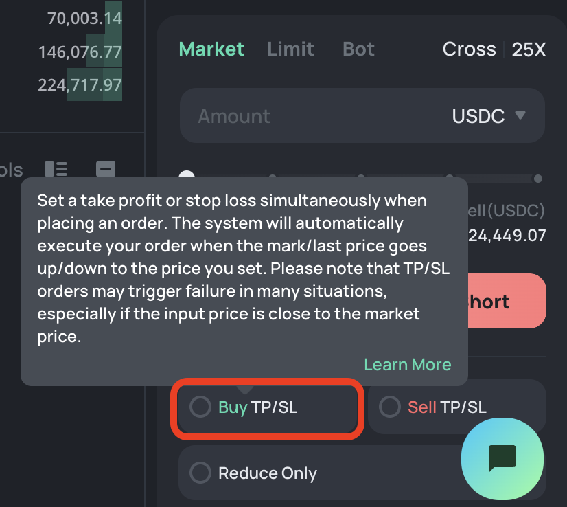 Users can set a take profit price and stop limit price for the order or position. If the market reaches that price , TP/SL order will be triggered, and a market order will be placed to decrease or completely close the position.