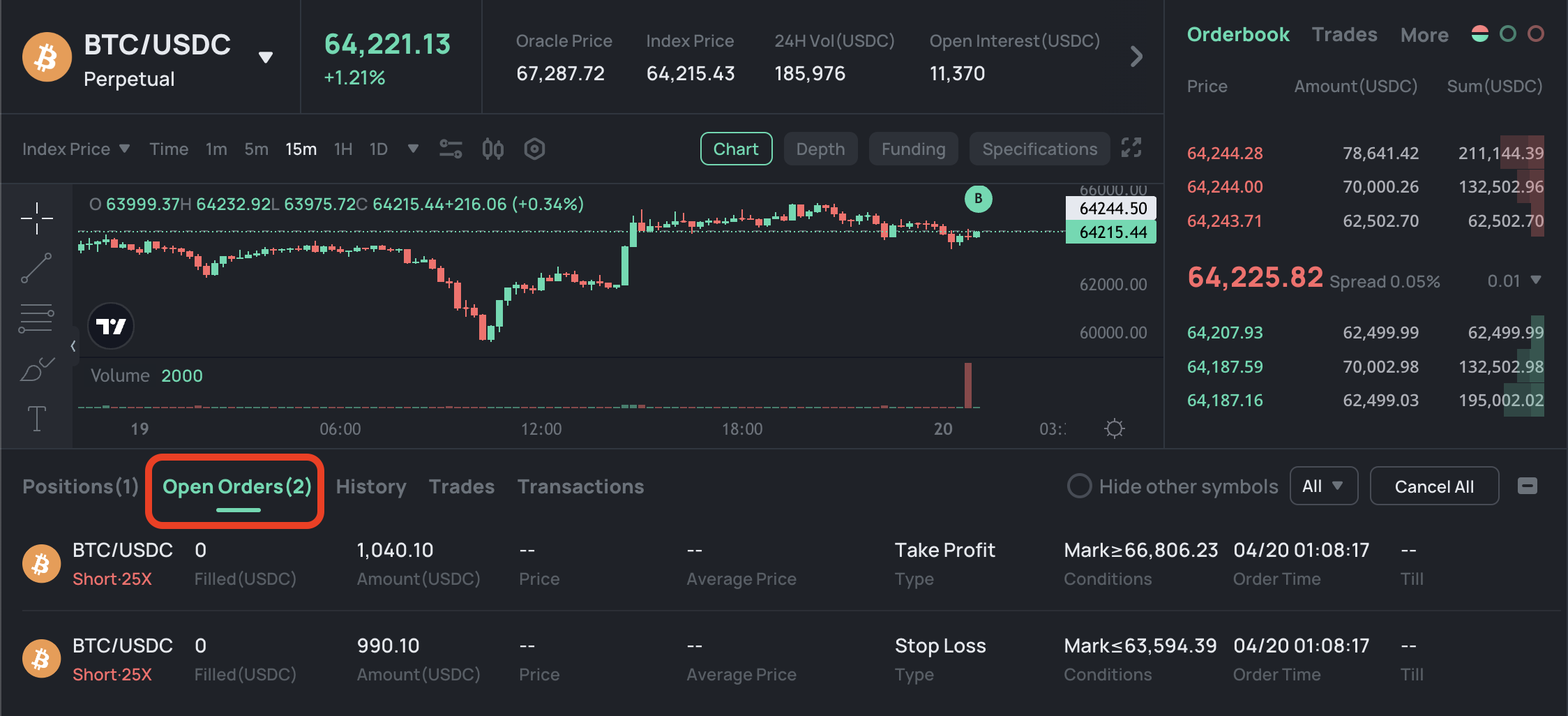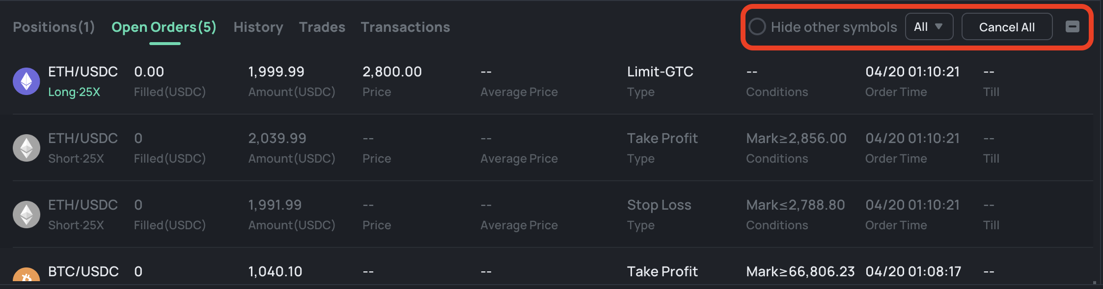 Select **\[Hide other symbols]** will help you filter out your \[TP/SL] orders for the current symbol. You can close any individual **\[TP/SL]** order or select **\[X Cancel All]** to close all orders with one click.