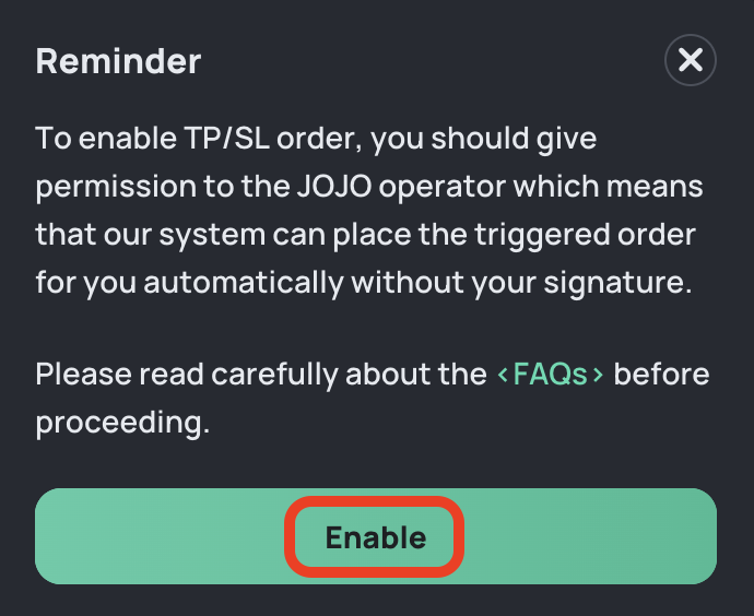 When users click **"Buy TP/SL"** button, there will be a reminder message and users have to confirm **"Enable"** the One-click Trade feature.