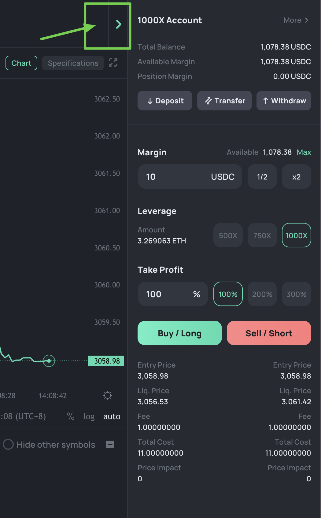 * The default investment margin is set at \[10] USDC, which you can adjust as desired. With 1000X leverage, a 10 USDC investment results in a position amount of 10,000 USDC.